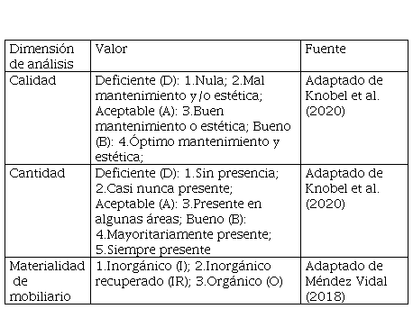 Por su parte, la aproximación a los espacios verdes de interés se realizó a través de observación directa en campo (Hernández Sampieri et. al., 2014) durante el mes de marzo del año 2021. Consistió en la visita sistemática de las unidades de análisis, su recorrido a pie y la recolección de datos a través de un formulario de situaciones observables relacionados principalmente con servicios e infraestructuras del espacio público (Gentili et. al., 2020). Se consideraron variables de descripción generales como la ubicación absoluta y relativa, la superficie y longitud, la forma y la organización interna, así como también categorías y subcategorías específicas de observación (Tabla 1). Las categorías se valoraron en función de lo descripto en la (Tabla 2).