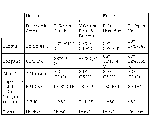 Ese proceso fue acompañado de la refuncionalización de las costas con el desarrollo de espacios verdes multiusos (Garriz y Schroeder, 2016; Lopez y Gentili, 2020). En virtud de ello, el área de estudio comprende cinco EVP asentados en el frente fluvial del río Limay: tres ubicados en la localidad de Neuquén -Paseo de la Costa, Sandra Canale y Valentina Brun de Duclout - y dos en la ciudad de Plottier –La Herradura y Nepen Hue- (Figura 1).