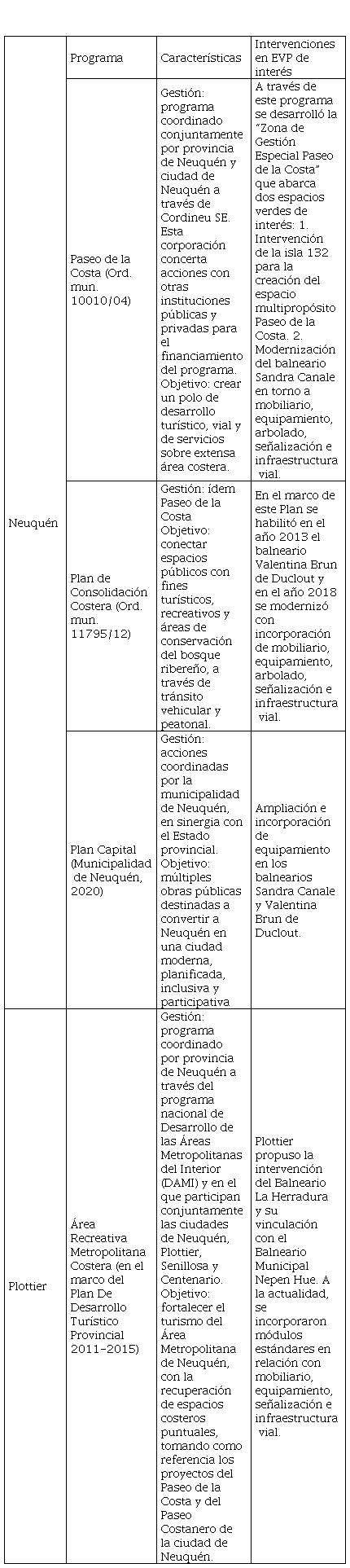 Si bien los primeros EVP sobre el bosque ribereño en el AMN surgieron de forma espontánea (Dirección General de Arquitectura y Urbanismo, 1992), en la región quien dio inicio al desarrollo costero fue la metrópolis neuquina. La propuesta inicial evolucionó hasta constituirse en la actualidad en 3 programas municipales de desarrollo costero en la ciudad de Neuquén. Por su parte, el desarrollo costero actual de las unidades de análisis de la ciudad de Plottier se enmarca dentro del Plan de Desarrollo Turístico Provincial 2011-2015 (Gobierno de la Provincia de Neuquén, 2011), a través del programa Área Recreativa Metropolitana Costera (Unidad Provincial de Enlace y Ejecución de Proyectos con Financiamiento Externo, 2013). En la (Tabla 4) se presentan las características de los programas.
