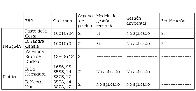 Siguiendo el párrafo anterior, los EVP bajo análisis que se integran a proyectos de renovación costera cuentan con un órgano de gestión territorial definido, pero no así de gestión ambiental. Si bien en Plottier se sancionó en el año 2017 un programa para la preservación de las costas donde se asientan los EVP, éste no está vigente actualmente. Por su parte, aunque Neuquén cuenta con un importante cúmulo de ordenanzas municipales en torno al OTA de los espacios costeros y para dos de los EVP propone la creación de un órgano de gestión ambiental, este finalmente no se consolidó. En relación con eso, Roitman (2018) considera al espacio público como un termómetro de la gestión en materia de políticas públicas y ambientales. Superando un discurso político ecologista, en la materialización de los planes de acción de los EVP se manifiestan deficiencias en relación con las cuestiones ambientales.