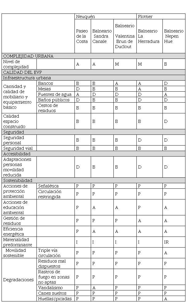 Al comparar los cinco espacios verdes, se puede clasificar decrecientemente el nivel de complejidad urbana de los EVP de la siguiente forma: Paseo de la Costa, Sandra Canale, Valentina Brun de Duclout, La Herradura y Nepen Hue. Relacionado con lo anterior, el balneario Nepen Hue es el que cuenta con mayores deficiencias en su calidad general. A su vez, es el único que cuenta con mobiliario y equipamiento de material predominantemente inorgánico recuperable (en los demás espacios verdes prevalece la materialidad inorgánica). En contraposición, el Paseo de la Costa y el balneario Sandra Canale son los que presentan, en general, una mejor calidad en las categorías analizadas.
