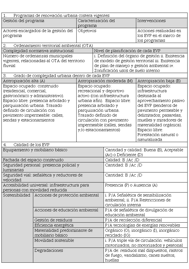 La información recolectada se sistematizó a través de una herramienta de base de datos y un Sistema de Información Geográfica [SIG]. Los datos se categorizaron en torno a 4 variables de interés (Tabla 1) y se sometieron a un análisis descriptivo cualitativo (Hernández Sampieri et. al., 2014). Por último, los resultados se estructuraron en 5 secciones: caracterización general de los EVP; descripción de los programas de renovación costera; exposición del OTA a nivel municipal y EVP; cualificación de calidad y complejidad de las unidades de análisis; y análisis multidimensional de los resultados.