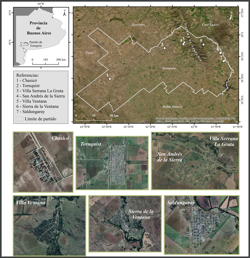 El partido de Tornquist se encuentra en el suroeste de la provincia de Buenos Aires, República Argentina (Figura 1). Con una superficie de 4.160 km² alberga a una población de 14.810 habitantes (Instituto Nacional de Estadística y Censos de la República Argentina [INDEC], 2024) distribuida en diversas localidades entre las cuales se destacan Tornquist, cabecera del partido, Sierra de la Ventana, Villa Ventana, Saldungaray, Villa Serrana La Gruta, San Andrés de la Sierra y Chasicó.