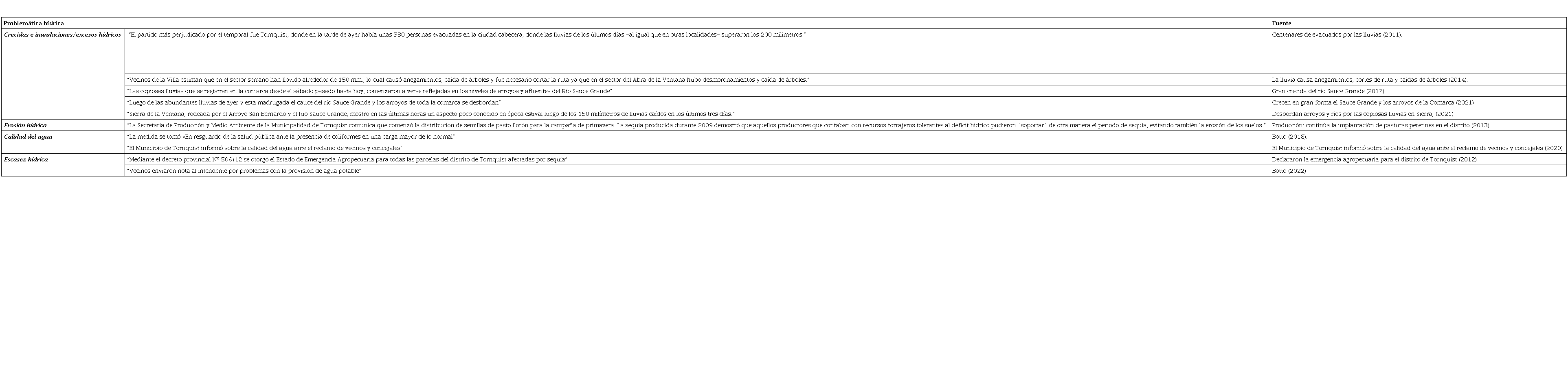 En relación con las problemáticas hídricas, en la Tabla 1 se muestra una breve recopilación de titulares de artículos de la prensa escrita local y regional que informan acerca de situaciones ligadas al agua en el partido de Tornquist en los últimos años. Las crecidas torrenciales y de corta duración son una de las problemáticas más frecuentes en las cuencas del sistema de Ventania. Dichos eventos repercuten sobre la población ocasionando aislamiento temporal, la interrupción de vías de comunicación, la inundación de sectores urbanos aledaños al curso principal, la evacuación de personas y pérdidas humanas y económicas (Volonté, 2017). Sumado a ello, se manifiesta un proceso paralelo, la ocupación de áreas potencialmente inundables, agravando así la exposición de la población (Campo et al., 2010). Otra problemática vigente en el partido de Tornquist es la escasez de agua que se agrava durante los ciclos secos. Esto repercute en el abastecimiento de agua para consumo principalmente en verano cuando se incrementa la demanda por la gran afluencia de turistas que visitan el lugar (Zapperi y Volonté, 2024). Cabe destacar que la provisión de agua proviene del recurso hídrico subterráneo por lo que resulta estratégico para el desarrollo socioeconómico del partido (Albouy et al., 2022). Al mismo tiempo, las dificultades de abastecimiento a través de esta fuente, han generado reclamos de la comunidad local para que se complemente el suministro con fuentes de agua superficial (Montico et al., 2024) que son desviadas aguas abajo y empleadas por partidos fuera de los límites de las cuencas, como Bahía Blanca y Coronel Rosales (Zilio et al., 2019). Por otra parte, la escasez de agua genera condiciones propicias para la propagación de incendios, en cuyo manejo debe ser considerada la disponibilidad de agua. Por su parte, también puede mencionarse como problemática la erosión hídrica. Su activación por procesos derivados de la intensificación de actividades agrícolas ha dado lugar a la formación de cárcavas en el partido (Beron de la Puente et al., 2022). Paralelamente, aspectos relacionados con la calidad del agua, como el impacto de la actividad agropecuaria sobre las cuencas, han sido mencionados como puntos a considerar en el Plan Estratégico de Desarrollo del Municipio de Tornquist. Asimismo, se ha identificado la preocupación de algunos sectores de la población local por la posible contaminación de los cursos de agua superficiales, principalmente en áreas aledañas a la localidad de Villa Ventana (Zapperi y Volonté, 2024).