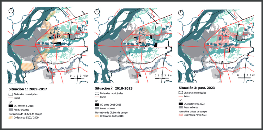 Entre los hallazgos, al poner en relación estas dimensiones de análisis, se reconocen tres importantes períodos: En primer lugar, entre 2000–2009 se observó una etapa de gestación y expansión inicial en el que se consolidan los primeros emprendimientos en torno a corredores viales estratégicos (RP 43, RP 5) y orientado por el primer Código de Planeamiento Urbano mediante la definición de Zonas de Interés Paisajístico. En segundo lugar, entre 2010 y 2017, luego de la aprobación de la Ordenanza 5202/2009 de clubes de campo, se observa un auge del modelo mediante la intensificación de la producción de UC, acompañada por una retórica de estilo de vida aspiracional. Sin embargo, existe un momento de quiebre a partir del ciclo húmedo 2016–2017 que expone sus primeros impactos: anegamientos y protestas vecinales. El momento de crisis motivó temporalmente la prohibición de UC, sin embargo, esto tuvo un rápido viraje durante una nueva gestión, justificado por la confianza sobre algunas mejoras infraestructurales en un momento de sequía.