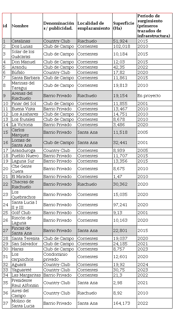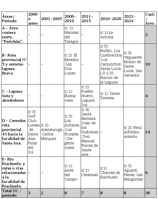 Este estudio se centra en un recorte territorial en base a las localidades Capital, Riachuelo (Departamento Capital) y Santa Ana (Departamento San Cosme); hacia donde se observa el mayor proceso de despliegue de nuevas UC (Figura 1). Si se observa el proceso de expansión suburbana de la Capital a partir del relevamiento realizado en Rus (2023) y ampliado para este trabajo, es posible observar una tendencia de aumento de la mancha urbanizada. En torno a las áreas urbanas anexadas entre 2010-2024 podemos decir que existen un total de 902 ha. de UC en el área metropolitana del Gran Corrientes (se desestima un caso en proyecto). En la Tabla 1 se registra un total de 37 UC hasta 2024 de diferentes denominaciones (country, club de campo, barrio privado, condominio privado), de las cuales 28 se localizan en la Capital, 5 en Santa Ana y 4 en Riachuelo.