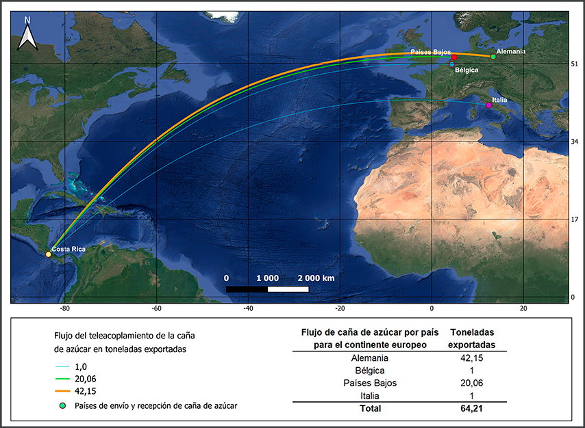 La Figura 8 muestra los sistemas y componentes del MT aplicado al caso del cultivo de caña de azúcar en Cajón. El cultivo de caña, en cuanto a sus flujos comerciales, difiere de los otros dos principalmente por su carácter más doméstico (Dirección Nacional de Extensión Agropecuaria [DNEA], 2020) (Figura 9). No obstante, siempre registra flujos importantes, principalmente a Alemania y a Países Bajos, con un 66% y 31% de las exportaciones respectivamente. La principal razón de que los flujos tengan una orientación más doméstica es probablemente la legislación de la agroindustria de la caña de azúcar (ley No 7818 de 1998), la cual pone un tope a la cantidad de producción para cada zona cañera e ingenio (Barrantes Mora y Chaves Solera, 2006).