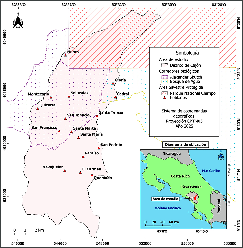 La comunidad principal y cabecera del distrito es El Carmen. La mayor parte del distrito es rural. Su área es de aproximadamente 11,886 ha., con una población aproximada de 11,026 personas según el último censo poblacional del 2022. En el área del distrito se encuentran siete zonas de vida según la clasificación de Holdridge (Holdridge, 1967), entre las que destaca el bosque muy húmedo premontano (46.8% del área), bosque pluvial premontano (30.1%) y bosque pluvial montano bajo (16.5%). La mayor parte de los suelos del distrito son del orden ultisol (89.6%), seguido del orden andisol (9.6%) y entisoles (1%). El distrito de Cajón es, además, parte de las zonas de amortiguamiento de áreas protegidas de alta importancia socioecológica como el Parque Nacional Chirripó y el Parque Internacional La Amistad. Como parte de las estrategias para fortalecer esta función de amortiguamiento, se han establecido tres corredores biológicos colindantes entre sí: el Alexander Skutch (6.010 ha), el Bosque de Agua (15.795 ha) y el Río Cañas (5.252 ha). En estos corredores se busca lograr conciliar las actividades productivas rurales, especialmente la agropecuaria, con los objetivos de conservación ambiental que mejoren la integridad ecológica no solo de estos corredores, sino también de las áreas silvestres protegidas a las cuales estos corredores amortiguan (Arauz-Beita y Arias-Navarro, 2016; Sistema Nacional de Áreas de Conservación [SINAC], 2018; Martinez y Montoya-Greenheck, 2021). Debido en gran parte a esta vital función es que es imperativo analizar los procesos de transformación del paisaje en sitios como Cajón de Pérez Zeledón.