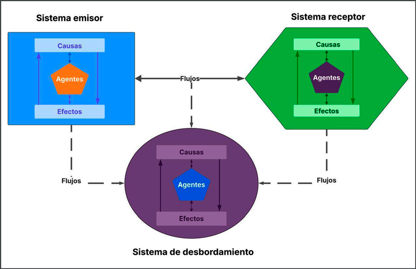 Los teleacoplamientos parten de un flujo o movimiento de materiales, personas, energía, organismos, capital y/o información entre dos o más sistemas. Los sistemas principales son el emisor y el receptor (Figura 2). A su vez, en el proceso de flujo se pueden tener efectos indirectos en otros sistemas, conocidos como sistemas de desbordamiento (‘spillover’). Los flujos, además, son facilitados por agentes (instituciones, corporaciones, grupos productivos y otros actores), y se procuran identificar y analizar las causas de los flujos. Por último, se consideran los efectos socioecológicos que resultan de los flujos entre sistemas. Es importante resaltar la bidireccionalidad en las relaciones entre los componentes de los sistemas y entre los sistemas, denotando una realimentación en ambas direcciones.