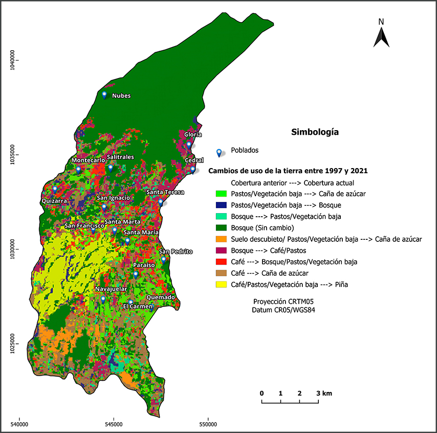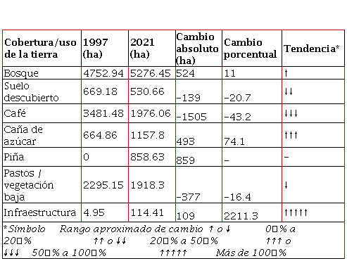 En términos absolutos, destaca la disminución de las áreas dedicadas al café (-1,505 ha), seguido por el de pastos/vegetación baja (-377 ha) (Tabla 1). También resaltan particularmente los aumentos en las áreas destinadas al cultivo de la caña de azúcar (+493 ha) y la piña (+859 ha). El aumento de infraestructura (+109 ha) estuvo muy por debajo de estos cultivos en términos absolutos, así como también de la cobertura de bosque (+524 ha). Sin embargo, en términos relativos, el aumento en infraestructura fue prominente, ya que pasó de 4.95 ha en 1997 a 114.41 ha en 2021, lo que corresponde a un aumento porcentual de 2,211%. Le sigue el aumento de un 74.1% en el cultivo de caña y un 11% en bosque. En reducción porcentual, destaca el café con un -43.2%, seguido por suelo descubierto con un -20.7% y pastos/vegetación baja con un -16.4%.