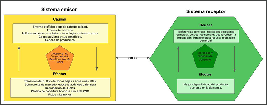 La Figura 4 muestra los principales componentes de los sistemas principales en el teleacoplamiento asociado a la producción de café en Cajón. Como principales agentes emisores están las cooperativas CoopeAgri R.L. (que capta la mayor parte la producción de café del distrito), y CoopeCedral R.L, así como también la corporación comercial internacional Volcafé. Otro agente institucional asociado al envío es el Instituto del Café de Costa Rica [ICAFE], institución pública no estatal que busca, entre otras cosas, apoyar la producción, proceso, exportación y comercialización del café costarricense (ICAFE, 2023).