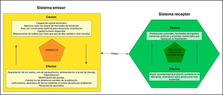 Si bien se reconoce que en el caso del teleacoplamiento de la piña hay múltiples agentes involucrados en el sistema de envío, quizás el principal a resaltar es la subsidiaria PINDECO de la transnacional Del Monte debido a su grado de influencia en el flujo. Al igual que para el café y la caña, los principales agentes asociados a los sistemas de recepción son los mercados internacionales y las cadenas de comercialización que mueven esos mercados. En cuanto a las causas del teleacoplamiento en el sistema de recepción de la piña, se identificó la preferencia cultural mundial por frutas tropicales, una robusta logística comercial gracias a las empresas transnacionales, así como ciertas facilidades que otorgan las políticas y acuerdos comerciales.