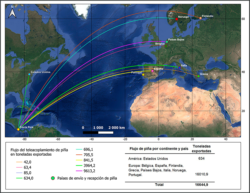 La Figura 6 muestra los sistemas y componentes del MT aplicado al cultivo de piña en Cajón. El sistema de recepción del teleacoplamiento asociado a este cultivo se compone mayoritariamente de países del continente europeo y los EE. UU. (Figura 7). Si bien los destinos del cultivo de piña son menos que los del café, el flujo en términos de volumen exportado es mayor en comparación, como se aprecia en la Figura 7. Los flujos de este cultivo se dan principalmente hacia Europa: el 57.7% de las exportaciones fue hacia Países Bajos, seguido por Italia con un 23.8%, y en tercer lugar España con poco más de un 5%. El resto del flujo de recepción lo completan otras naciones europeas, junto con Estados Unidos.