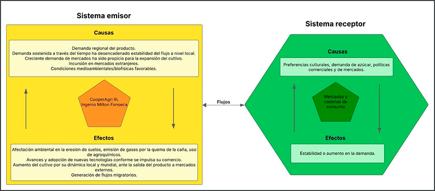 Entre los efectos de este flujo está la erosión y degradación de los suelos, impactos ambientales por uso de agroquímicos, la emisión de gases de efecto invernadero por las quemas estacionales y afectaciones a la fauna microbiana (Barrantes Mora y Chaves Solera, 2006; Chaves y Chavarría, 2012; León Sáenz y Arroyo Blanco, 2012). Socioeconómicamente, para el caso de Cajón, este teleacoplamiento se asocia también con un flujo migratorio de mano de obra extranjera, principalmente de nicaragüenses que laboran en el proceso de corta. En periodo de cosecha, esta actividad representa una fuente importante de ingresos y de activación económica para el distrito y la zona en general (León Sáenz y Arroyo Blanco, 2012).