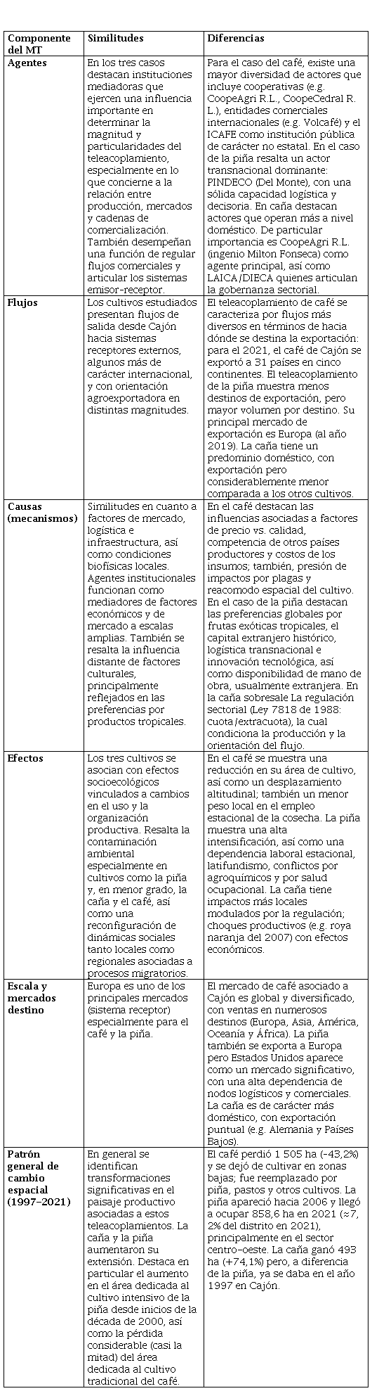 En el caso de Cajón, se identificaron transformaciones significativas en el paisaje productivo vinculadas a estos teleacoplamientos. Destaca particularmente la influencia del teleacoplamiento del cultivo de piña desde inicios de la década de 2000, junto con la pérdida considerable del área dedicada al cultivo tradicional del café, atribuible tanto a factores relacionados con el cambio climático (en sí mismo un teleacoplamiento) como a dinámicas de mercado globales. También destaca el cambio paisajístico asociado al teleacoplamiento de la caña de azúcar, aunque de carácter más doméstico comparado a los otros dos cultivos.