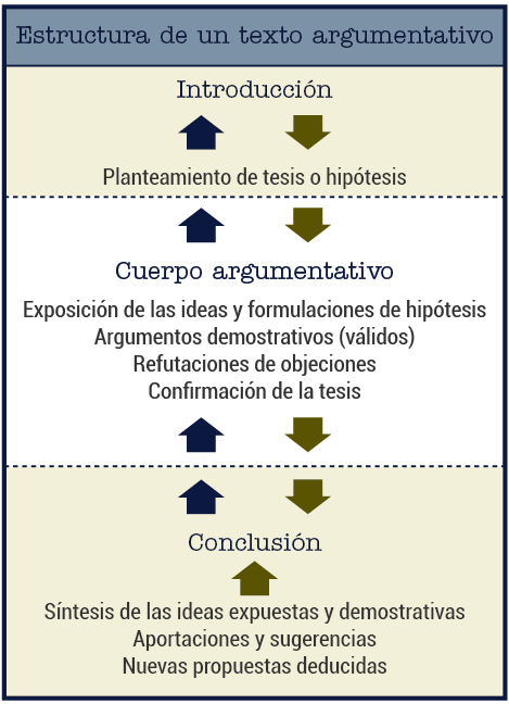 Como se puede observar en la Figura 1, la argumentación tiene una estructura lógica, basada en lo preceptivo del discurso en donde se evidencian tres partes: la introducción, el cuerpo argumentativo y la conclusión. Básicamente en la parte introductoria se hace un planteamiento de la tesis que se quiere demostrar, el cuerpo del trabajo hace referencia a la exposición de los argumentos para comprobar la tesis planteada y la conclusión se refiere a la síntesis de la argumentación y el aporte y sugerencia a nuevas propuestas deducidas.