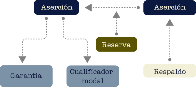 De acuerdo con este esquema, la aserción corresponde a la tesis que se va defender, a demostrar y sostener ya sea de forma oral o escrita, lo cual viene a ser el propósito de toda argumentación; la evidencia aporta informaciones o datos a la tesis para mantenerla y demostrarla; la garantía evalúa si tanto la inserción como la evidencia son eficaces y suficientes para los propósitos de la argumentación; el respaldo puede estar constituido de datos de autoridad o basados en creencias consolidadas socialmente, en estudios científicos, publicaciones o textos que apoyan la garantía, es decir, los fines argumentativos; el cualificador modal por su parte, especifica el grado de certeza, los términos, la fuerza de la aserción y las condiciones que la limitan; y, finalmente, la reserva se constituye en un espacio de la argumentación para mencionar las debilidades que se tienen acerca de la temática y la transformación que hace la persona que argumenta a su conveniencia. Se podrán decir que son conclusiones alternas.