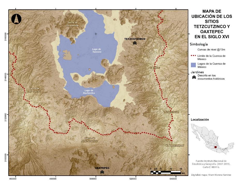 En cuanto a la estructura del artículo, en primer lugar, se describe el uso y la interpretación histórica de la noción de jardín y jardín prehispánico frente al jardín español. Ello permitirá comprender, hasta cierto punto, cuáles eran las semejanzas y diferencias de ambos tipos de jardines para poder comprender las formas en la que los estudiosos novohispanos asimilaban ambos al momento del Contacto. En este mismo apartado presentamos una descripción concreta sobre los jardines de Tetzcotzinco y Oaxtepec (Figura 1). Posteriormente, se describe qué es un jardín botánico para después presentar, someramente, cómo el discurso oficial de identidad nacional recurrió a lo largo del siglo XIX y en el siglo XX a representaciones e imaginarios del pasado prehispánico para resaltar las posibles particularidades del ser mexicano, pero sin distanciarse de los cánones del cientificismo positivista. Finalmente, presentamos las conclusiones y reflexiones derivadas de la propuesta de investigación.
