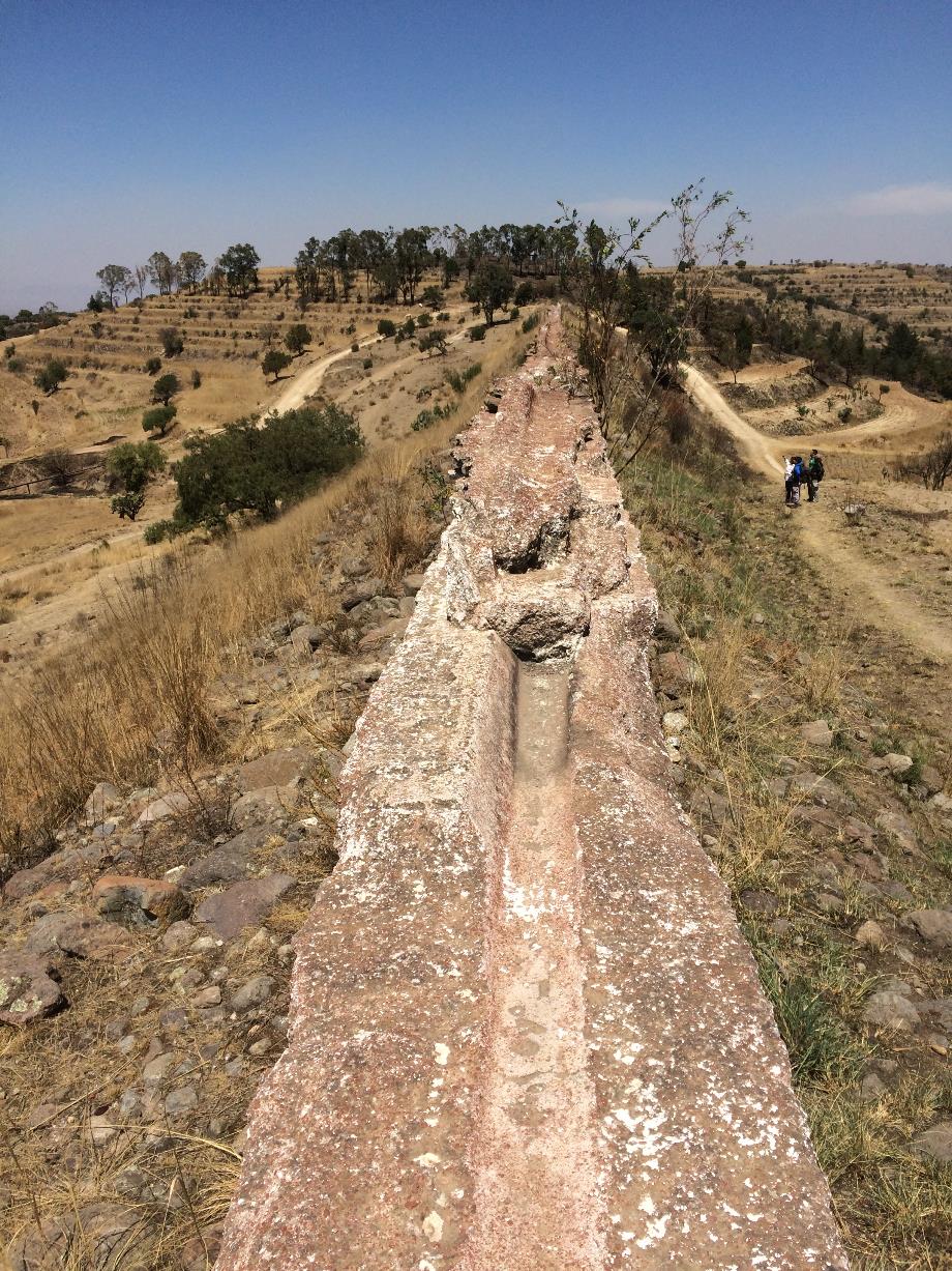 A partir del sistema hidráulico del lugar se puede entender la importancia de Tetzcotzingo. Considerando la abundancia de estructuras asociadas al manejo del agua obtenida del monte Tláloc, se reconoce la necesidad de mostrar el poder en torno al control del líquido vital. Todo este complejo arqueológico estaba estructurado formalmente por canales, estanques, rebosaderos y cisternas que alimentaban a su vez canales secundarios. Asimismo, el canal principal rodeaba las estructuras religiosas dedicadas a Tláloc –deidad acuática–, ubicadas en la cima. También se han encontrado petrograbados (Figura 4), localizados en la cima y en la ladera sur. En esta misma ladera sur se ubica la zona en donde cultivaban los árboles de tierra caliente debido a que es la zona con mayor asoleamiento, esto protegía a las especies de los vientos fríos del norte28.