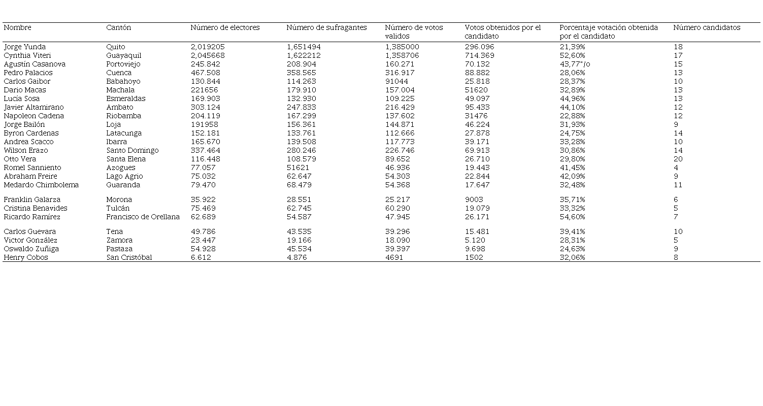 Otro antecedente para reforzar en anterior señalado es el del anterior alcalde Mauricio Rodas, quien llegó al cargo con el 58,5 % de la votación de sus electores y terminó su gestión con bajos niveles de popularidad, entre otros motivos, por la constante disputa con el Concejo Metropolitano. Otro caso llamativo es del entonces alcalde de Riobamba, Napoleón Cadena con el 22,88% de la votación, seguido de John Vinueza con 21,41%, quien posteriormente ganaría la alcaldía en el 2023 con apenas el 21,99%.