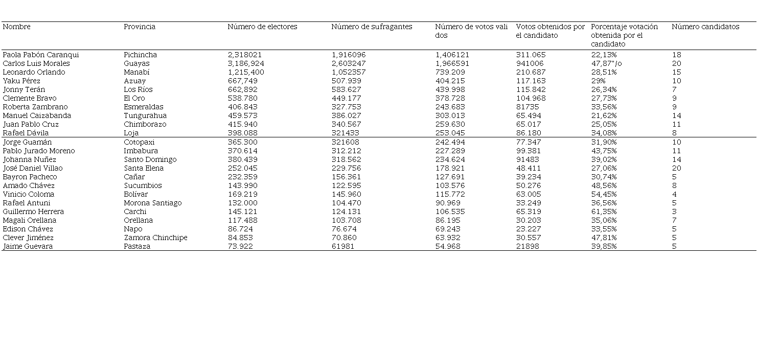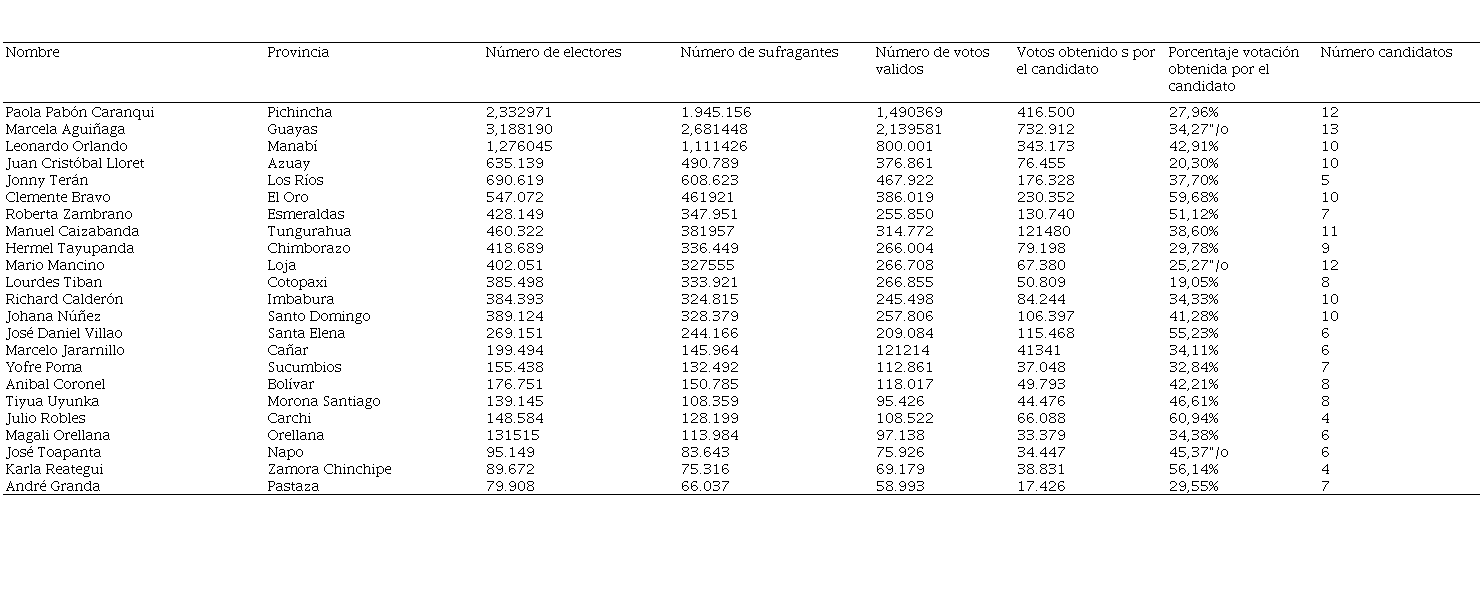 En el caso de las prefecturas, la situación mejora considerablemente, pues tenemos que, en las provincias de El Oro, Esmeraldas, Santa Elena, Carchi, y Zamora Chinchipe los prefectos electos obtuvieron una votación entre el 51% y 60%. Mientras que, en las provincias de Manabí, Los Ríos, Tungurahua, Santo Domingo, Bolívar, Morona Santiago y Napo el porcentaje de votación oscila entre el 37% y 46%. En la provincia de Pichincha Paola Pabón ganó con el 27,96%, mientras Marcela Aguiñaga en Guayas con 34,27% y Juan Cristóbal Lloret en Azuay con el 20,30%.