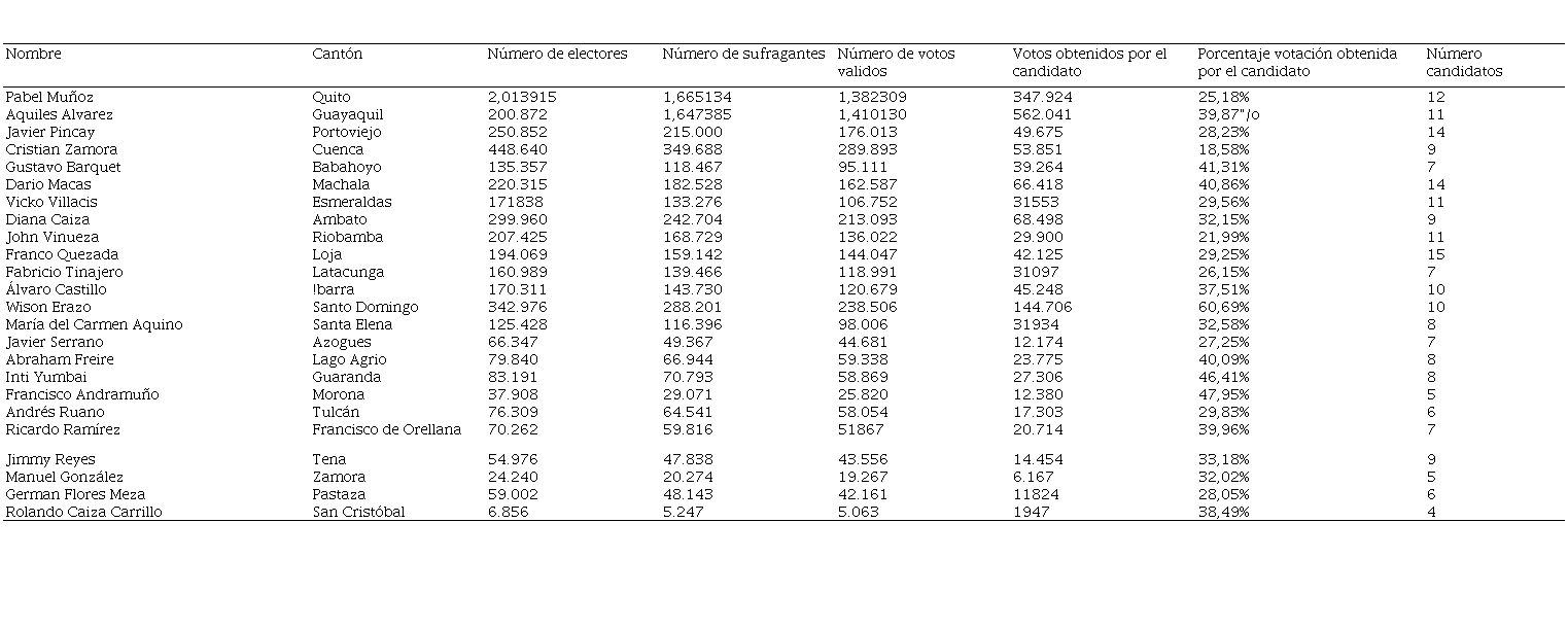 El caso de Cuenca, la capital azuaya llama la atención, en esta ciudad la alcaldía se disputó entre nueve candidatos, quedando una diferencia porcentual muy apretada entre el triunfador y sus contrincantes, así tenemos que el candidato ganador Cristian Zamora Matute obtuvo una votación del 18,58%, seguido por Pedro Palacios con 17,48%, Adrián Castro Piedra con 16,93%, Paul Carrasco con 16,77% y Roque Ordoñez con 14,01%.