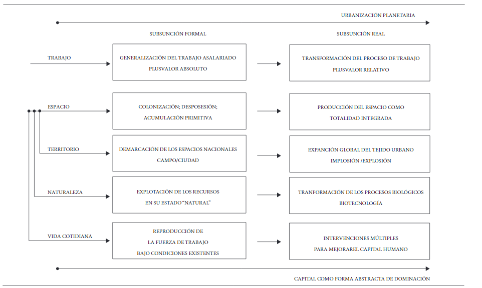 Estamos ahora en disposición de revisar la teoría preliminar de la urbanización con la que comenzaba este artículo. El capital toma el proceso de trabajo como lo encuentra antes de ir transformando la materialidad de este proceso, en su camino hacia la producción de plusvalor relativo a través de la reducción del tiempo de trabajo socialmente necesario. Como parte de este proceso el capital coloniza el espacio en el que se expande, antes de producir este espacio como una máquina integrada para la producción de plusvalor relativo a través del tiempo de rotación socialmente necesario. A escala global, la urbanización planetaria es una expresión de esta transición tendencial desde la subsunción formal a la subsunción real del espacio al capital. Este proceso puede ser desagregado en al menos tres dimensiones: territorio, naturaleza y vida cotidiana. En cada caso, la misma dinámica es repetida en formas diferentes: primero el capital toma el mundo como lo encuentra y después lo transforma, de forma cada vez más intensiva, dentro de un sistema cada vez más complejo de producción de plusvalor. Este proceso, conducido por el capital, está simultáneamente fortaleciéndolo como forma abstracta de dominación. Las leyes coercitivas de la competencia fuerzan progresivamente a todos los capitalistas —y todos los estados capitalistas— a expandir incesantemente la producción de plusvalor relativo, mediante la cual emerge el capital como «un sujeto autónomo y automotriz» (Starosta, 2014, p. 299). Por ello, la urbanización planetaria puede ser entendida como un «sistema grande, complejo, dinámico y alienado, que abarca personas y máquinas, y es conducido hacia la meta de la producción por la producción» (Postone, 1993, p. 270). El capital es el sujeto de la urbanización planetaria y ambos evolucionan en un unísono dialéctico mediante la transición multidimensional de la subsunción formal a la subsunción real. Este proceso puede ser esquematizado como indica la Figura 2.
