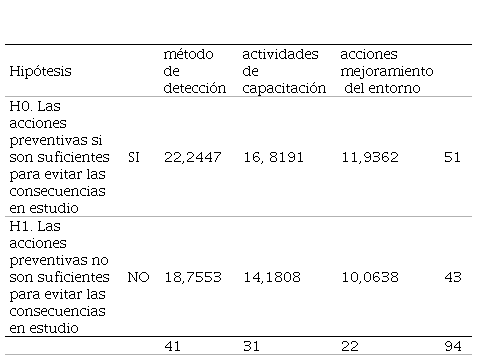 En el estadístico de prueba es Ji-cuadrado resultó X2= 5,23, y al comparar con un valor de la tabla de probabilidades para ji-cuadrado (X2), de modo que a 2 grados de libertad y alfa 0,05 es 5,99 como más aproximado. El valor calculado de (X2) se encuentra a la izquierda de la referencia 5,99, notando así una probabilidad asociada a valores superiores que hacen formal la aceptación de la hipótesis nula como son las acciones preventivas si son suficientes para evitar el desarrollo de las consecuencias en estudio (ver tabla 2).