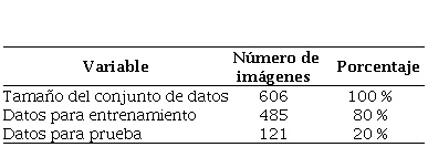 Para la división del dataset se utilizó el comando: train_split(), de la librería sklearn.model_selection especificando dos subconjuntos; el primero de entrenamiento (train) que contiene el 80% de los datos y el segundo de prueba (test) con el 20% de los datos restantes; la distribución de los datos se puede ver en la Tabla 1. El dataset completo tiene un formato de (606, 32, 32, 3), mientras que el conjunto de entrenamiento tiene un formato de (485, 32, 32, 3). El 80% del dataset equivale al conjunto de entrenamiento, con el cual se ajusta los parámetros del modelo y el 20% es el conjunto de test, con los que se evalúa el rendimiento del modelo entrenado (Aguilar, et al., 2019).