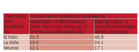 Los patrones espaciales que se muestran en la Figura 2, sugieren que los eventos de “El Niño” provocan incendios forestales en Victoria. Las estadísticas básicas refuerzan esta idea. La Tabla 1, muestra el porcentaje de ocurrencia de incendios forestales en esta región. Estos porcentajes están vinculados a diferentes fases ENOS. Los análisis comprendieron el período 1961-2010. Las dos bases de datos de incendios forestales acuerdan mostrar que los incendios extremos ocurren predominantemente durante los eventos de “El Niño”. Los resultados establecen que 48.8% a 59.3% de los incendios forestales extremos ocurrieron durante una fase de “El Niño”. Estos resultados justificaron la incorporación de un indicador de “El Niño” en el VSBI.