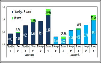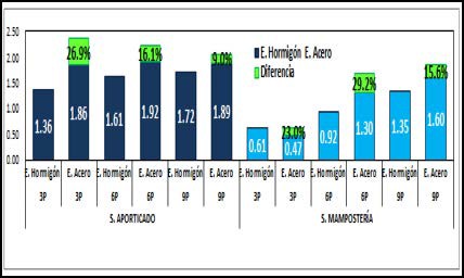 El porcentaje de reducción obtenido en peso, cortante y periodo de vibración de las estructuras de acero fue de un 5% – 10 % más que en las estructuras de hormigón.