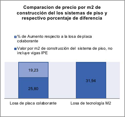 Además del incremento en el costo de obra de las edificaciones, el sistema constructivo de la losa con paneles de tecnología M2 en comparación con el sistema constructivo de placa colaborante, es menos eficiente, ya que requiere más tiempo de ejecución, debido a la necesidad de más procedimientos técnicos en obra, convirtiéndose en un proyecto más caro y menos viable.