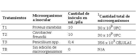 Las cantidades de inóculo empleadas para cada tratamiento descritas en la tabla 8.