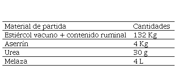 Los materiales empleados para la creación de pilas de compost fueron: estiércol vacuno, contenido ruminal, aserrín, urea y melaza. La cantidad de material empleado se determinó de manera experimental; con una relación C: N inicial calculada de 34,15, este valor se encuentra dentro del rango óptimo establecido por la FAO (2013).