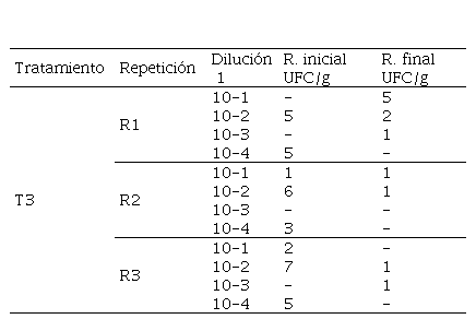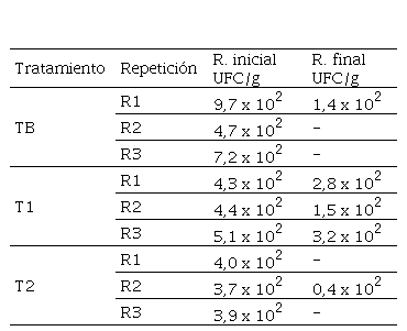 Antes de iniciar con el proceso de control, se realizó un recuento inicial de bacterias y hongos, a fin de asegurar su presencia en las pilas de compost. Se realizó a los 3 días de creación de las pilas, para ello se tomaron 2,5 g de cada pila de compost y se adicionaron 50 mL de agua destilada, se homogenizó las soluciones madre por agitación y mediante el método de diluciones seriadas (hasta 10-4) se procedió a la siembra por extensión de bacterias en agar Antibiótico 19 con un periodo de incubación de 48 h a 35°C y hongos en agar OGY con periodo de siete días para su desarrollo.