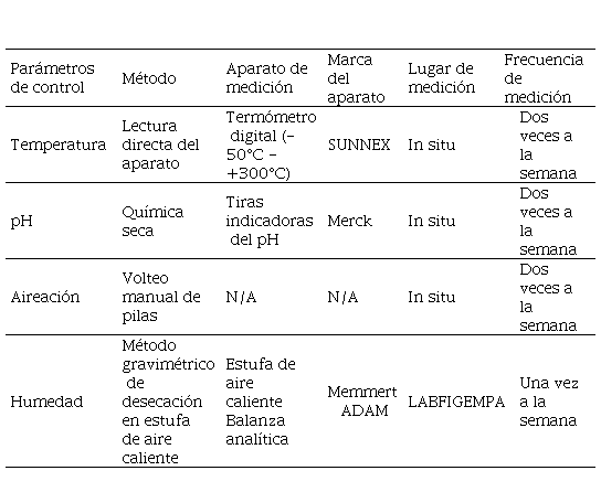 Posteriormente, se controlaron parámetros como: temperatura, pH, aireación y humedad, durante todo el proceso de compostaje, según lo indica la tabla 1. Los datos registrados permitieron realizar correcciones in situ a fin de que el proceso produjera un compost inocuo y con cantidades óptimas de macro nutrientes.