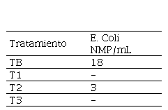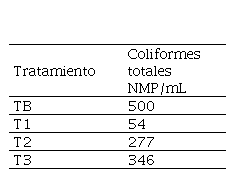 Por otro lado, para coliformes totales se reporta el valor máximo de 54 NMP para el tratamiento T1 como se muestra en la tabla 19, este valor no puede ser comparado con el establecido en la Norma Chilena 2880 debido a que en ella se pide valores únicamente para el género Enterobacter y el grupo coliformes totales comprende más de un género de bacteria como: Klebsella, Citrobacter, Escherichia.