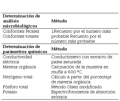 Los análisis físicos, químicos y microbiológicos sobre muestras de compost maduro, se realizaron en el laboratorio de Química Agrícola y Suelos de la Facultad de Ciencias Agrícolas y en los laboratorios del Centro de Biología de la Universidad Central del Ecuador, respectivamente. Los análisis físicos realizados se basaron en el aspecto general de la pila de compost, es decir, se evaluó su color y olor. Los análisis químicos realizados fueron: la temperatura, el pH, el porcentaje de humedad, el porcentaje de materia orgánica, conductividad eléctrica, nitrógeno, fósforo y potasio. Mientras que los análisis microbiológicos comprenden: presencia de Coliformes fecales (E. Coli) y Coliformes totales.