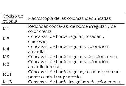 En estas cajas las colonias bacterianas fueron evaluadas con los criterios macroscópicos precedentes. Así, en la tabla 5 se muestra la macroscopía observada.