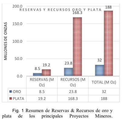 Después de hacer un análisis de la información disponible de los principales proyectos mineros (figura 1) y tomando como base los informes con estándar canadiense NI 43-101, de la Bolsa de Valores de Toronto principalmente; se realizó un resumen del potencial minero en oro y plata; y un resumen de los recursos y reservas de todos los principales proyectos del Ecuador (figura 2), tanto para oro-plata (figura 2a) y cobre-molibdeno (figura 2b y tabla 2), expuestos en las tablas. Constituyendo así, un potencial real de la disponibilidad a la fecha de recursos y reservas con que cuenta el país.