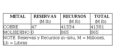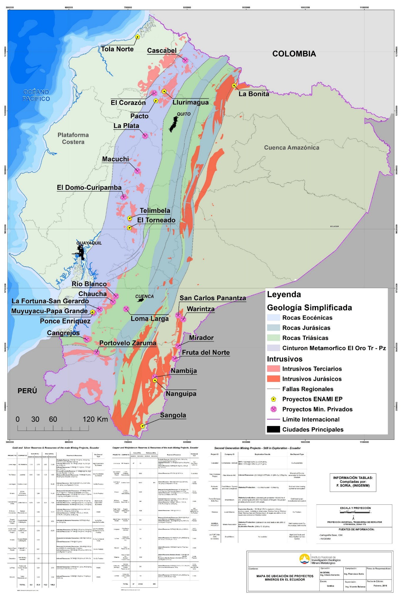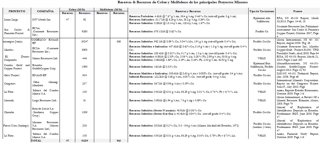 Según documentos disponibles e informes con estándar canadiense NI 43-101, para el Ecuador se tienen: Reservas de 8,5 millones de onzas de oro y 19,2 millones de onzas de plata; Recursos de 23,8 millones de onzas de oro y 168,3 millones de onzas de plata. Reservas de 47 millones de libras de cobre; 41,334 millones de libras de cobre como recurso y 865 millones de libras de molibdeno como recurso.