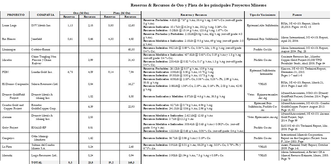 Según información disponible de los principales proyectos mineros y de acuerdo a informes con norma internacional NI 43-101, para el Ecuador se tiene: Reservas de Oro 8.5 M oz y Plata 19.2 M oz y Recursos 23.8 M oz y 168.3 M oz.