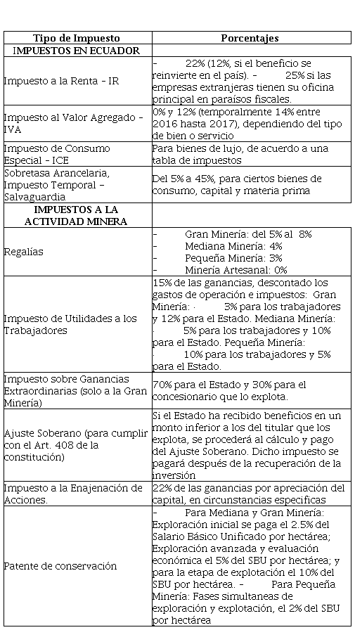 En el análisis del marco Legal Minero en el Ecuador se ha determinado que ha variado desde la Constitución de 2008, debido a modificaciones que han afectado las inversiones mineras privadas, como las establecidas en el Art. 408 de esta constitución según el cual el Estado participará de los beneficios y aprovechamiento de los recursos naturales, en un monto que no será inferior a los de la empresa que los explota; un impuesto del 50.1% considerado uno de los más altos del mundo.