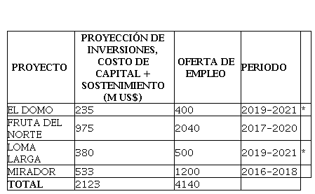 La oferta de empleo directo durante la construcción de la infraestructura de las minas, comprendida entre el 2017 al 2021 será de 4,140 empleos directos, de los cuales 30% corresponden a técnicos, administrativos y gerenciales; 70% a operadores y obreros, de preferencia personal local de las zonas de influencia de los proyectos mineros; y para el período 2021 al 2038 será de 3,846 empleos directos (tabla 4).