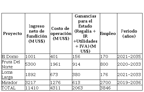 Los beneficios económicos para el estado sumados los 4 proyectos y que corresponden a regalía + IR + utilidades + IVA, en 17 años de vida útil de las minas será de 2,063 millones de dólares. Con un promedio anual de ganancias por impuestos de 150 millones de dólares en función del precio de los metales en el mercado.