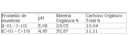 Las muestras de suelo de los sitios identificados como intervenido y medianamente conservado fueron procesadas para la determinación de: pH, materia orgánica (MO) y carbono orgánico total (COT).