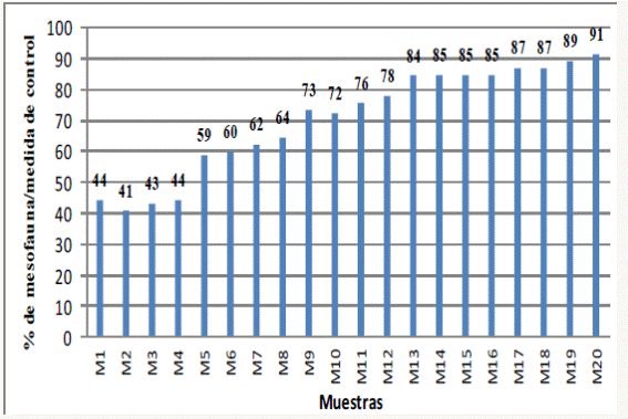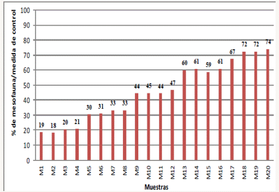 Observamos que en las primeras cuatro muestras la mesofauna edáfica cuantificada, disminuye considerablemente: Las muestras, M1 y M4 representa el 44% de mesofauna, existiendo una disminución del 56% respecto a la medida de control, la muestra M2 presenta el 41% de mesofauna, por lo que se deduce una disminución del 59%, la muestra M3 representa el 43% de mesofauna por lo que se redujo el 57% la mesofauna respecto a la medida de control. En las subsiguientes muestras se observa una tendencia al aumento de los valores porcentuales de cada una.