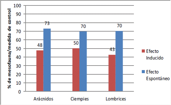 En referencia a la variedad de mesofauna lombrices, se obtiene que, en el área de aplicación de la técnica del efecto Inducido se registró un 43% de especímenes, respecto a los resultados de la medida de control; en el mismo sentido, respecto a esta misma variedad se encontró el 70% de especímenes en el área de aplicación de la técnica del efecto Espontáneo, en comparación con los resultados de la medida de control que representa el cien por ciento. Por lo que se observa que existe un valor diferencial de 27% de especímenes encontrados, entre las dos técnicas.