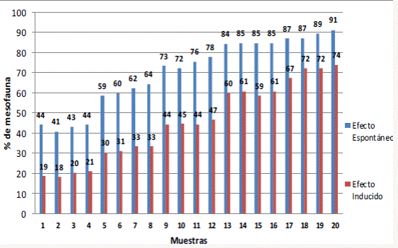 Al comparar los resultados porcentuales de la mesofauna edáfica, obtenidos de los estudios realizados en las dos áreas en las cuales se aplicó las técnicas del Efecto Inducido y del Efecto Espontáneo de la microsísmica, observamos que en las primeras muestras existe una diferencia considerable en la reducción de mesofauna entre las dos técnicas de microsísmica. En tal sentido la muestra M1 presenta una diferencia del 40%, la muestra M2 del 38%, las muestras M3 y M4 el 36% de reducción, esto se atribuye a que las primeras muestras estuvieron más cercanas a los puntos de aplicación de la microsísmica.