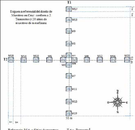 Se realizó la ubicación, trazado y medición de cada área de estudio, estableciendo el mismo diseño del “Muestreo en Cruz” conformado por 2 transectos que forman una cruz (+) de 51 metros de distancia cada uno, para lo cual el punto afectado por la microsísmica se ubicó en el centro de la intersección de los transectos, según se observa en la figura 1. En cada transecto se establecieron 10 sitios de muestreo de 1 metro cuadrado cada uno, separados por 5 metros de distancia, dando un total de 20 sitios muestreados por área de estudio.